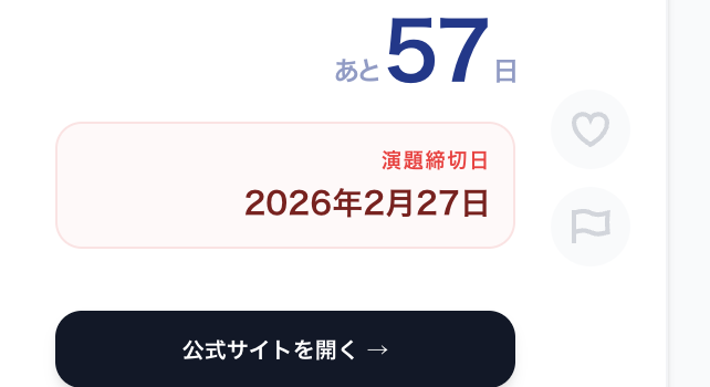 締切日は予告なく延長・変更される場合があります。本サイトの情報に基づいた行動により生じたトラブルについては責任を負いかねますので、必ず公式サイトの最新情報をご確認ください。
